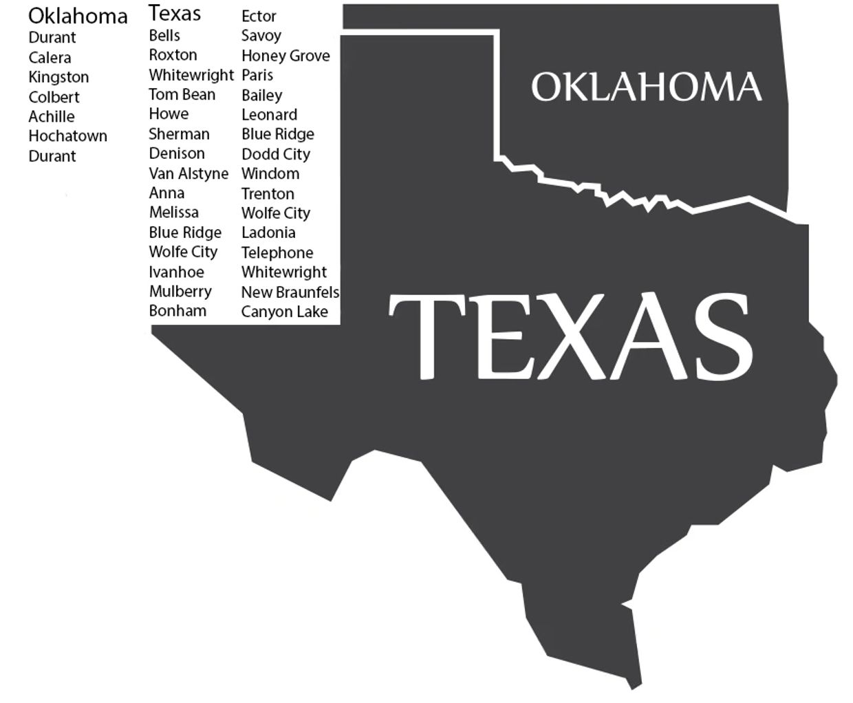 Bonham, Ravenna, Bells, Roxton, Whitewright, Tom Bean, Howe, Sherman, Denison, Van Alstyne, Anna, Melissa, Blue Ridge, Wolfe City, Ivanhoe, Mulberry, Ector, Savoy, Honey Grove, Paris, Bailey, Leonard, Dodd City, Windom, Trenton, Wolfe City, Ladonia, Telephone, Whitewright, New Braunfels, Canyon Lake, Randalph, Celeste, Ivanhoe, Roxton